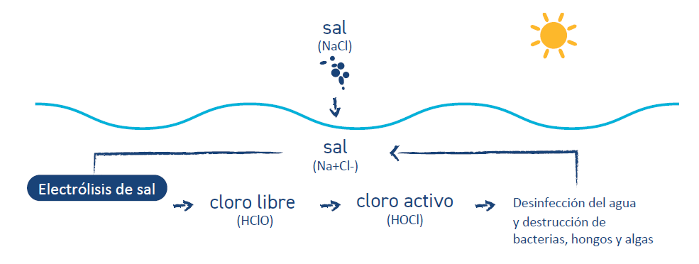 La sal, o cloruro de sodio, es un elemento natural ampliamente conocido. Sin embargo, sus propiedades aplicadas a la desinfección del agua son menos populares. Cuando se añade al agua en una concentración muy baja y se asocia a un electrolizador, permite, mediante un proceso de electrólisis salina, generar una desinfección continua. Se elimina así la molestia de tener que añadir manualmente productos desinfectantes de forma regular. El resultado es un agua limpia y una experiencia de baño mucho más agradable.